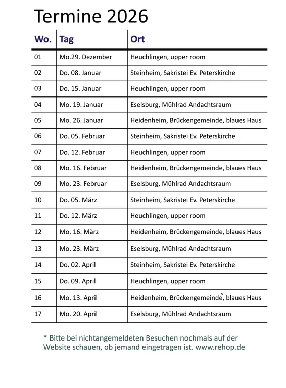 Du möchtest Rehop kennenlernen? Dann melde Dich oder komm vorbei! Du suchst einen Raum zum Beten oder fühlst Dich gerufen zum Gebet? Dann komm zum Gebetstag oder nimm Kontakt auf, du bist herzlich willkommen!